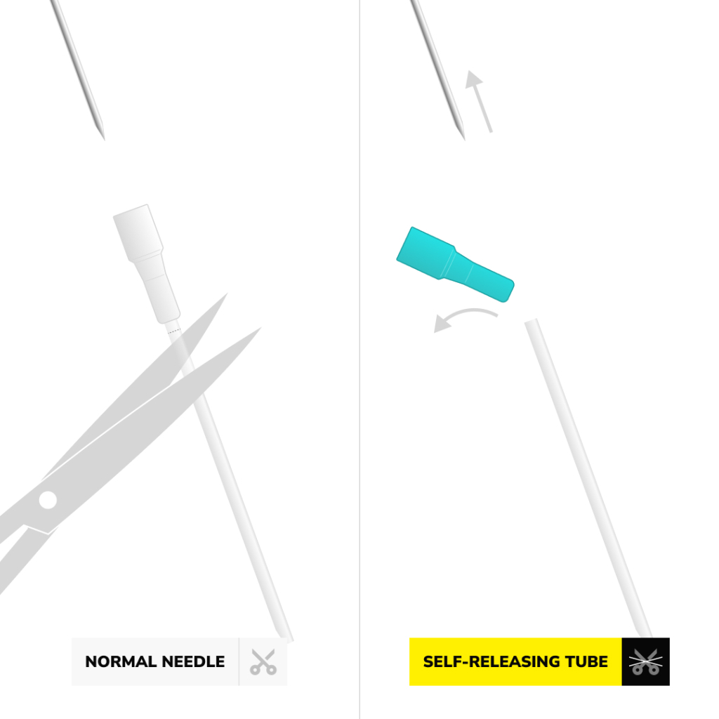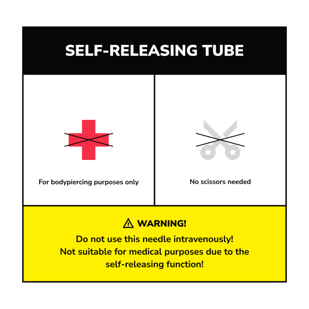Questi aghi sono affilati e sterilizzati con gas EO. In ogni confezione ci sono 50 aghi sterilizzati individualmente, ognuno dotato di catetere. La cosa più pratica di questo modello è che non devi più usare forbici per tagliare il catetere. L'ago è dotato di una funzione anti-rilascio, il che significa che la parte colorata del catetere si stacca quando l'ago viene ritirato subito dopo aver fatto il piercing. In questo modo, nel corpo rimane solo il catetere, pronto per far passare i gioielli attraverso il foro.