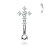 Questa asta curva è realizzata in acciaio chirurgico e può essere scelta in tre bellissimi colori. I colori utilizzati provengono dal rodio per quanto riguarda la versione argento mentre dall'oro 14 carati per le altre due. L'unica differenza data dal colore, gli obbiettivi e il colore della pietra sono gli stessi. Le pietre che vedi in cima al gioiello formano una croce, una pietra nella parte superiore, una per lato, due nella parte inferiore e una pietra più grande nella parte centrale. Tutte le pietre sono rotonde e bloccate con delle piccole pinze.