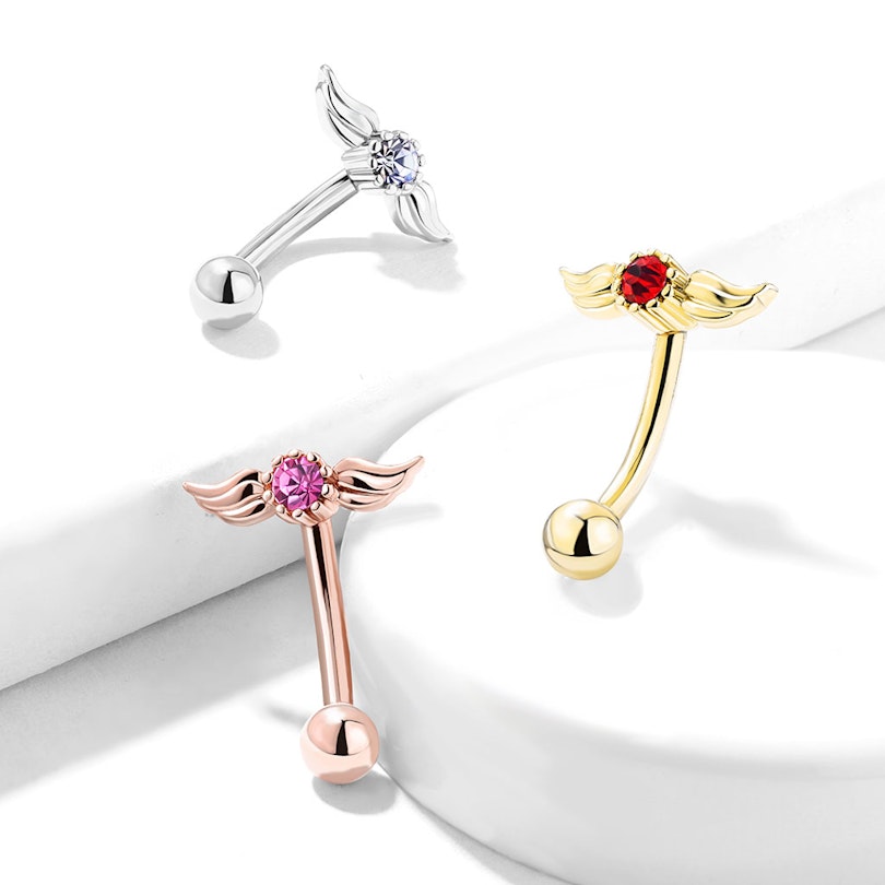 Il gioiello che vedi nell'immagine è una barra curva, particolarmente adatta al piercing al sopracciglio. La barra ha una lunghezza di 8 mm, un diametro del filo di 1,2 mm e una sfera inferiore di 3 mm che può essere avvitata e svitata facilmente. La parte superiore di questo gioiello non ha la solita sfera, ma delle ali d'angelo al cui centro troviamo una bellissima pietra, che a seconda del colore della barra che scegli può essere a sua volta di diversi colori.