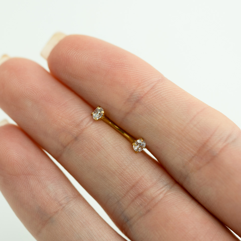 Il gioiello ha una linea molto sottile e la filettatura interna, che lo rende delicato. Le pietre giacciono saldamente incastonate sopra la barra, evitanto che il vostro piercing sia esposto ai bordi della filettatura,