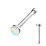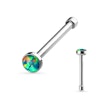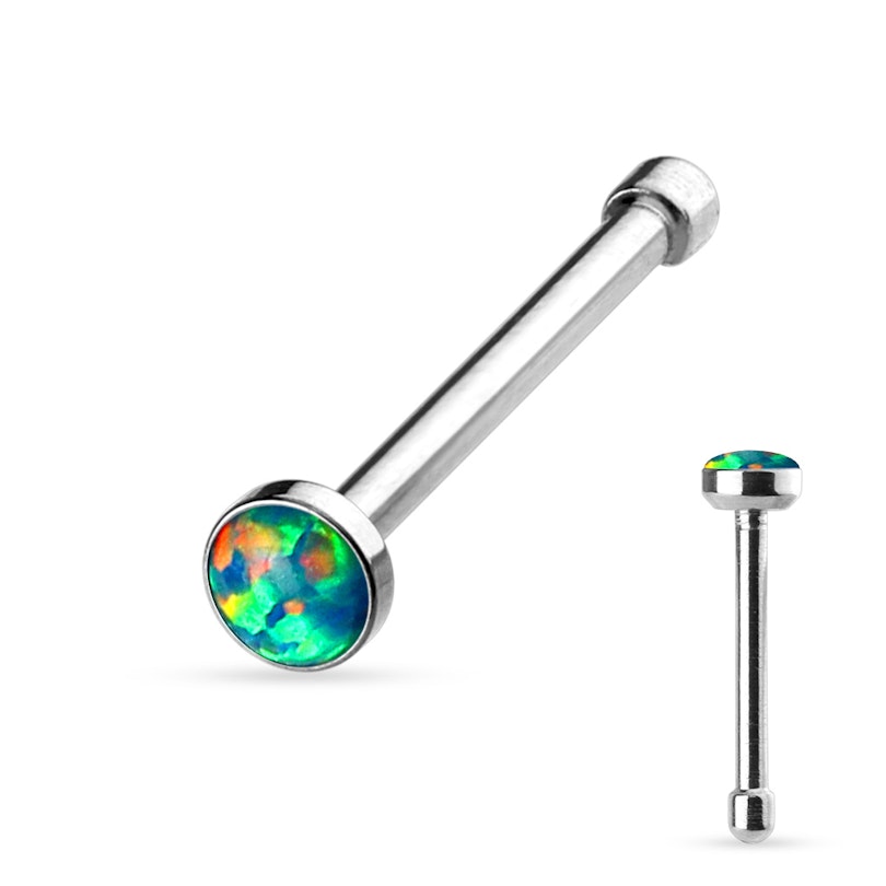 La barra da naso è lunga circa 6 mm. ed è dotata di una piccola sfera rotonda dalla parte opposta della pietra in opale che assicura una posizione fissa del gioiello una volta che questo viene inserito nel suo posto. La barra viene inserita nel piercing premendo leggermente la piccola sfera attraverso il foro del piercing nel quale finirà per posizionarsi in modo grazioso ed elegante. La piccola sfera è solo leggermente più grande del resto della barra che ha un diametro di 8 mm. Per questo motivo non ti devi preoccupare di provare dolori mentre inserisci questo piercing nel naso.