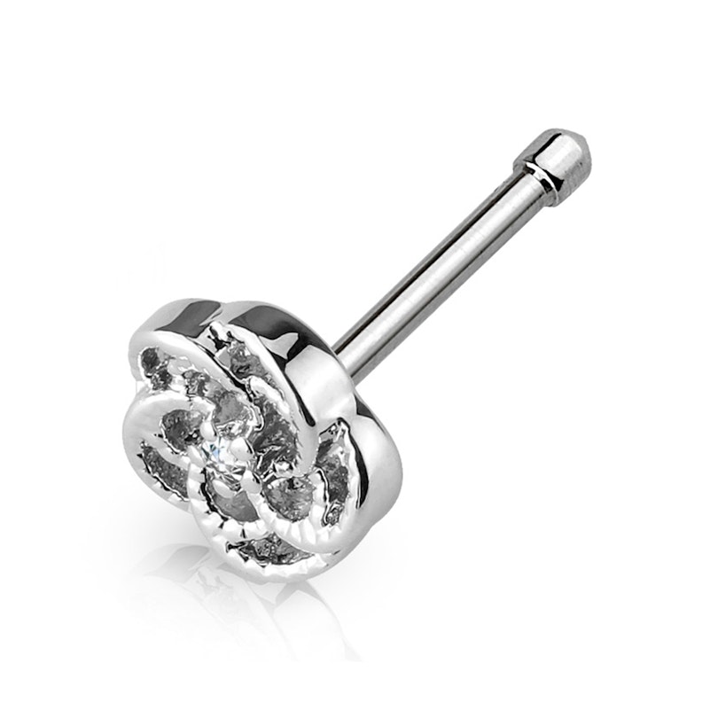 Questa graziosa barra da naso è composta da una barra dritta con una bellissima rosa nella parte superiore. La rosa è ricca di dettagli, comprendendo anche buchi che creano l'effetto di foglie sovrapposte in una struttura che ha come risultato finale quello di essere molto simile a un reale fiore. Nel mezzo del fiore si trova posizionata una piccola pietra di un colore coordinato allo stile brillante specchio di tutto il resto del gioiello.