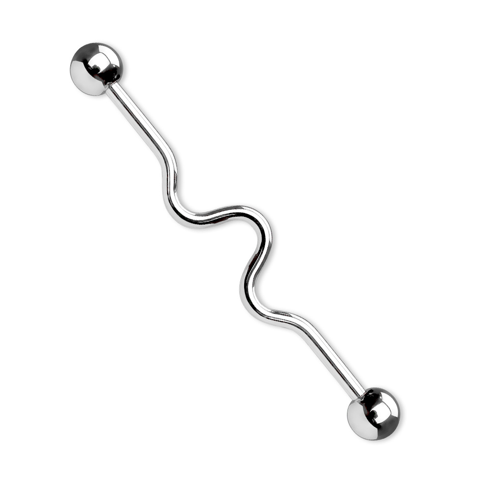 Magnifica barra industrial con due piccole onde che corrono lungo essa, disponibile in cinque diversi colori. Questo gioiello raggiunge il massimo del suo splendore quando si trova tra due buchi, nella parte superiore dell'orecchio. Per indossarla, svita ambedue le sfere alle estremità e fai scivolare la barra nei tuoi fori da piercing. Una volta posizionata, avvita di nuovo saldamente le sfere sulla barra.