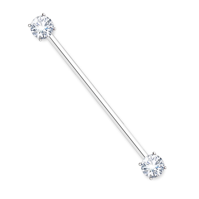 Nell'immagine soprastante hai la possibilità di vedere un'elegante barra perfetta per il piercing industrial. Questo gioiello è fatto in acciaio chirurgico ed è dotato di una pietra trasparente a ciascuna delle estremità. Le pietre hanno una forma rotonda e sono incastrate in una forma concava che emerge dal gioiello sottolineandone l'eleganza. Le pietre sono ulteriormente fissate al gioiello grazie anche a quattro tentacoli.