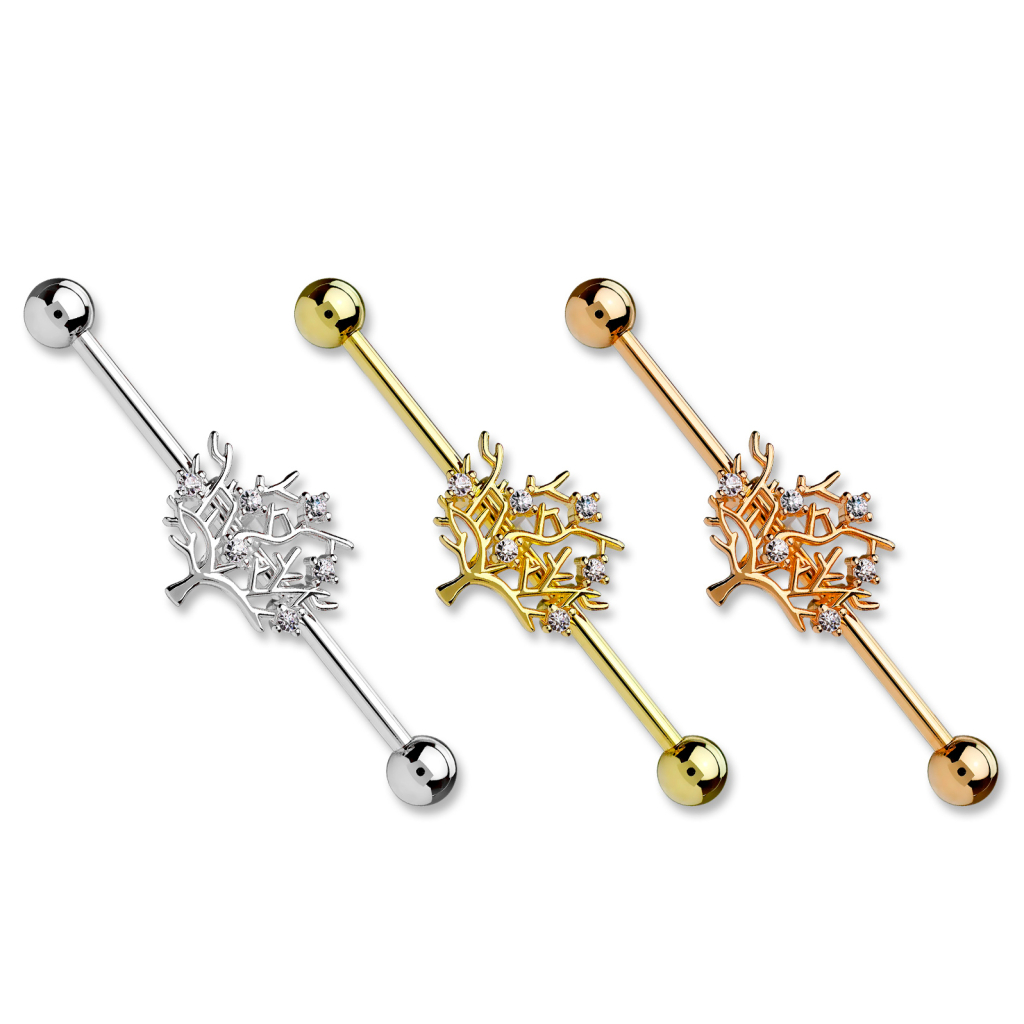 La barra è realizzata in acciaio chirurgico ed è disponibile in tre colori. L'unica differenza tra i modelli è il colore; la forma e le pietre brillanti sono le stesse. Il gioiello è realizzato in ottone ed è stato successivamente ricoperto da uno strato di colore.