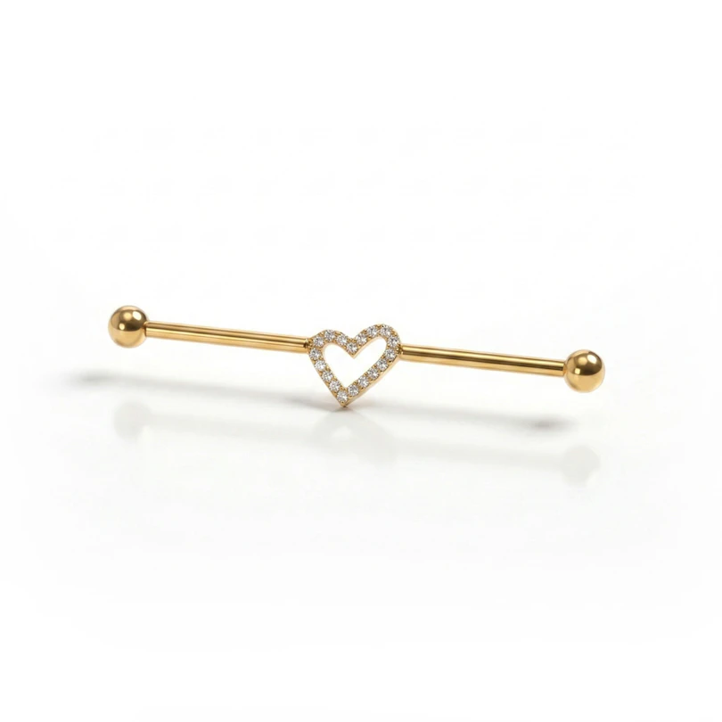 La barra industrial in titanio con cuore centrale aggiunge un tocco più delicato alla classica barra industrial. Il cuore centrale, contornato da piccole pietre ordinate monetate a griffe, dona carattere al gioiello senza appesantirlo. Disponibile nei colori oro e grigio argento, l'attenzione rimane sul dettaglio centrale lasciando la barra pulita ed equilibrata.