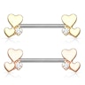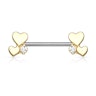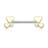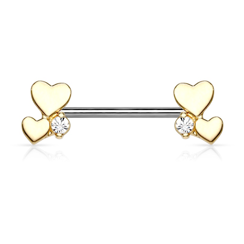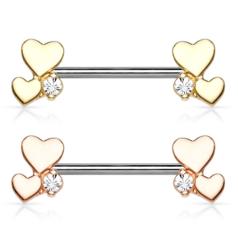 Come già detto, ci sono due cuori a ciascuna delle estremità, uno leggermente più grande dell'altro. Tra i due è incastonata una piccola pietra brillante. Tutti e tre questi elementi sono realizzati in ottone. Sono saldati assieme in un unico pezzo che può essere svitato in modo da poter inserire la barra nel piercing. La barra è del tutto simmetrica, questo significa che le estremità hanno simmetria speculare. La barra per il capezzolo è disponibile in due diversi colori. Puoi scegliere le estremità a forma di cuore in oro o in oro rosa. Sono del tutto identiche a eccezione del colore.