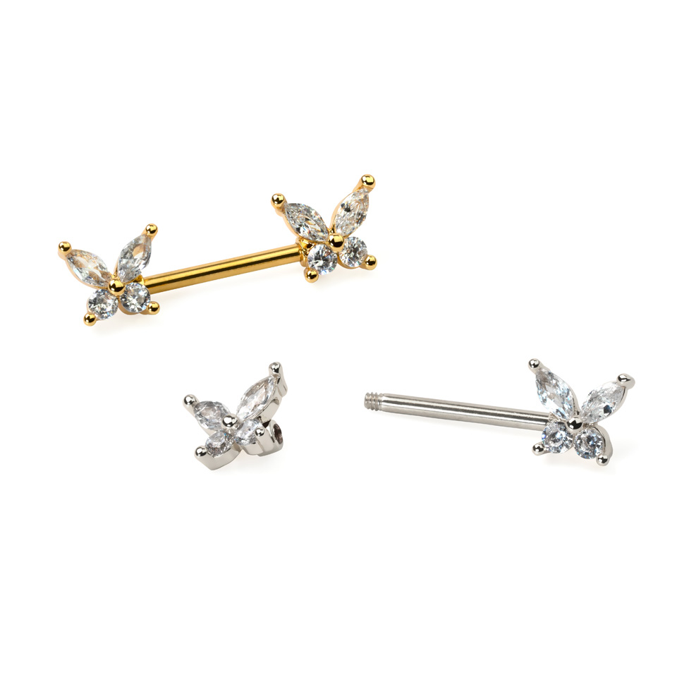 Questo gioiello trendy ha classe e non può assolutamente mancare nella tua collezione. Le ali di ogni farfalla sono adornate di pietre di zirconia che apportano un tocco sofisticato al grazioso piercing al capezzolo.