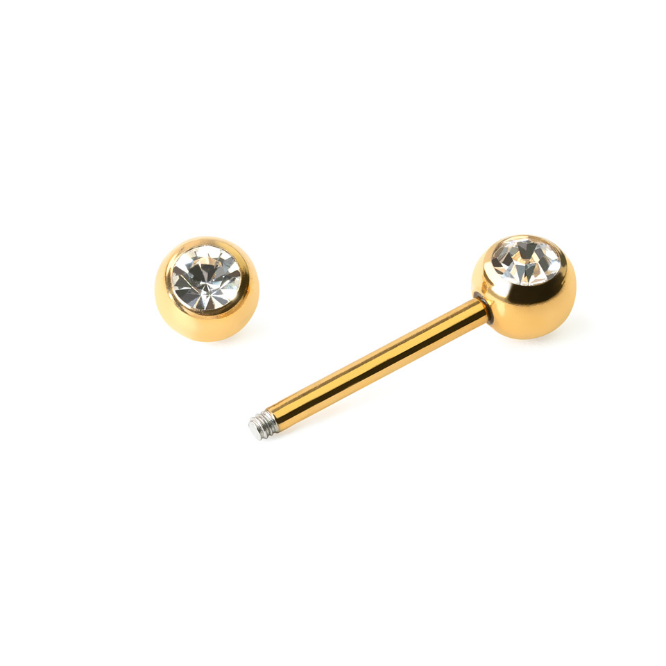 La barra presenta due grandi sfere di 6 mm. Non si tratta di un gioiello discreto, le sfere attireranno l'attenzione di chiunque possa vederle. Inoltre, le sfere presentano una pietra brillante incastonata. Le pietre rotonde hanno un taglio a diamante, così splenderanno luminose quando colpite dalla luce.