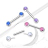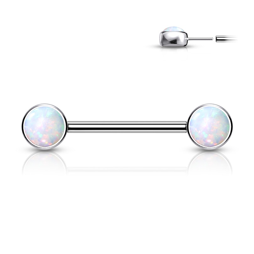 L'intero gioiello è realizzato in titanio. La barra ha una lunghezza di 14 mm, così da adattarsi alla maggior parte dei piercing al capezzolo. Le sfere sono grandi 6 mm e piatte sul retro, così da aderire al seno, a seconda della posizione del tuo piercing. Le opali nelle sfere non sono vere, ma sintetiche. Sono incastonate nella sfera, pertanto non è stata utilizzata colla per fissarle. Inoltre, puoi scegliere tra diversi colori.
