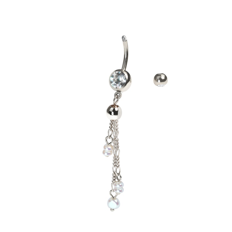 Questa barra per ombelico con catene e perle presenta pietre di zirconia cubica incastonate in entrambe le sfere e delicate catene che pendono dalla sfera inferiore, abbellite da perle sintetiche di varie dimensioni.