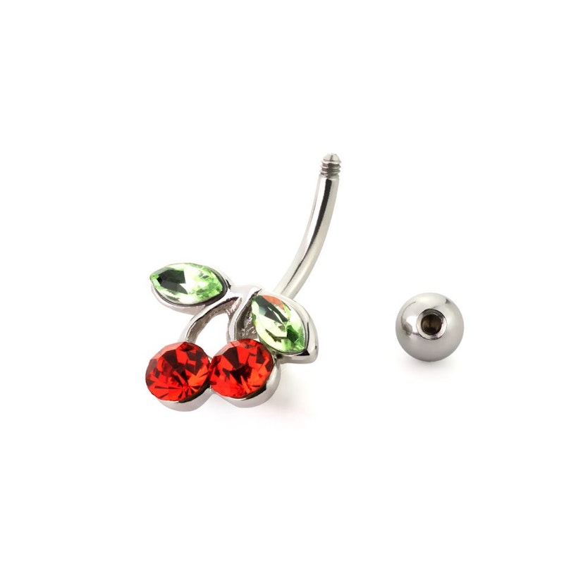 Chi non ama le dolci e deliziose ciliegie? Adesso puoi anche indossarle come gioiello per il tuo ombelico. Questo gioiello è realizzato in acciaio chirurgico, e decorato con un paio di ciliegie rosse e due foglie verdi. Sia le ciliegie che le foglie sono fatte di bellissime gemme colorate, in rosso e verde. Inoltre nota che questo piercing non ha pendenti perché le ciliegie sono parte della sfera inferiore.Quindi, è ideale da indossare tutti i giorni: non avrai pendenti che che ti disturbano o che rimangono impigliati nei tuoi vestiti.