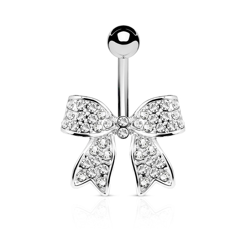 Questa affascinante barra per ombelico presenta un scintillante fiocco. L'asta e la sfera sono realizzate in acciaio chirurgico, mentre il fiocco è di ottone. Il fiocco è tempestato di delicate pietre zirconi, con due grandi pietre al centro. Il gioiello è dotato di filettatura esterna, quindi per fissarlo al piercing è sufficiente avvitare la sfera sull'asta. Questo bellissimo gioiello non può mancare nella tua collezione di gioielli da piercing.
