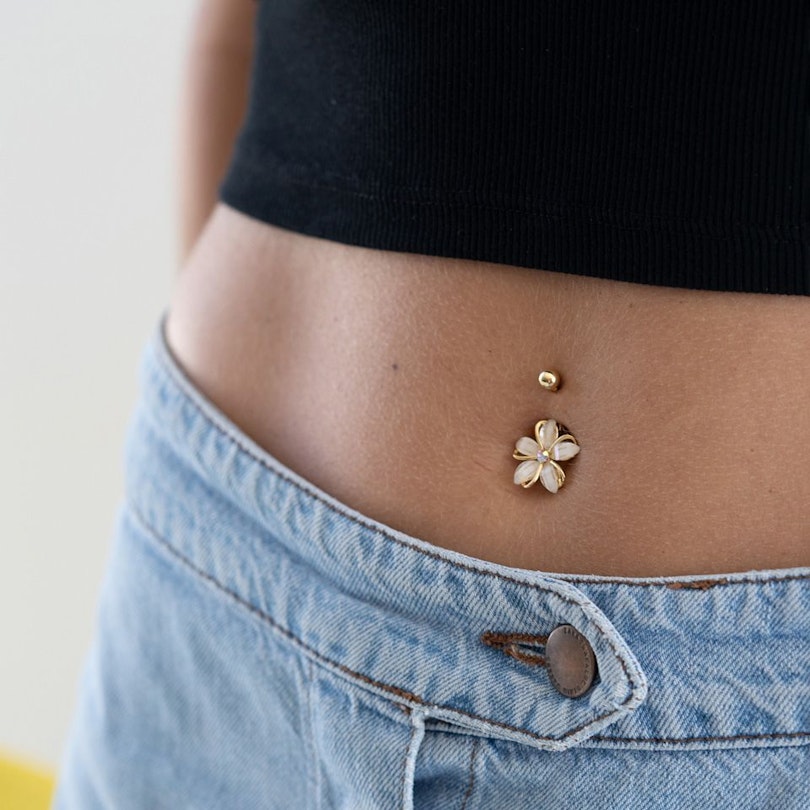 Stai cercando un gioiello chic? Questa barra ombelico presenta un fiore ricco di dettagli nella parte inferiore e una classica sfera di chiusura nella parte superiore. Puoi scegliere tra tre bellissimi colori quello che si abbina al tuo stile.