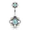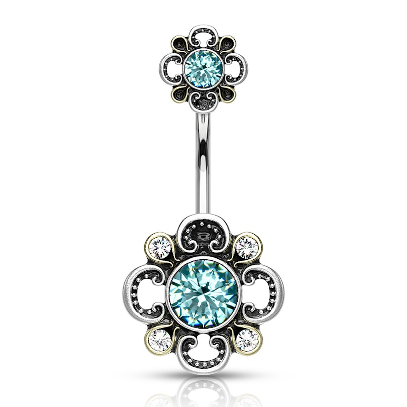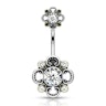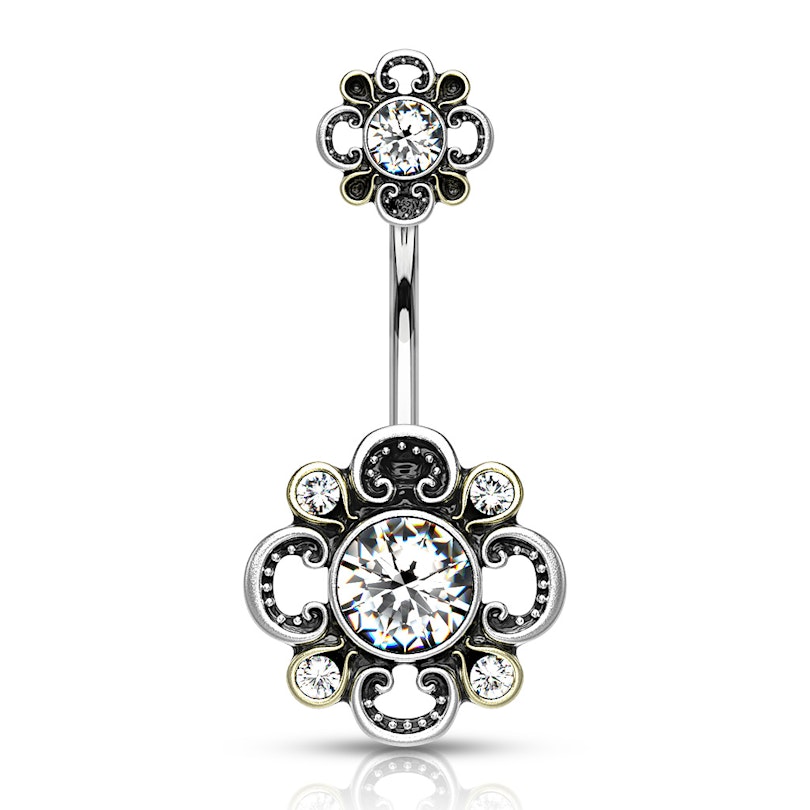 Barra per ombelico con fiore in filigrana e foglie di gemme