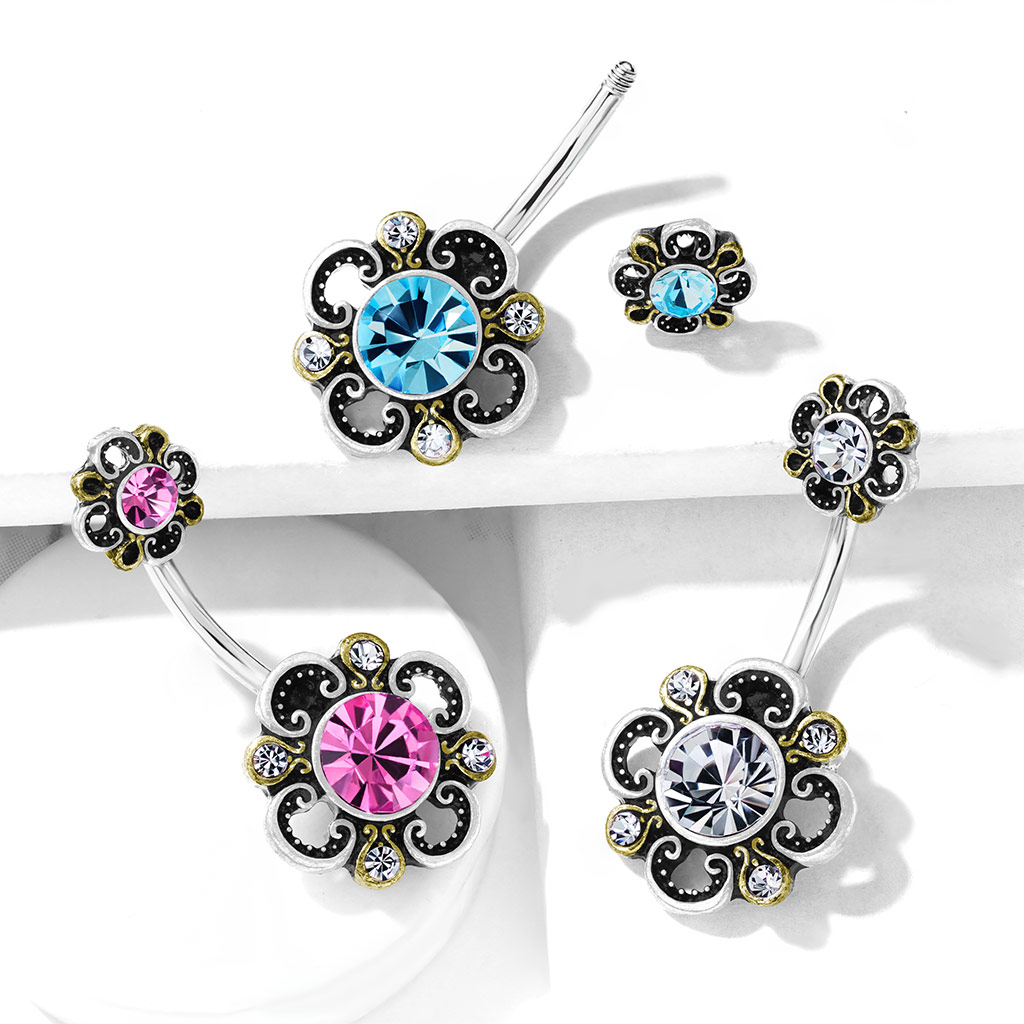 Barra per ombelico con fiore in filigrana e foglie di gemme