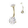 Questa barra per ombelico in titanio presenta una grande pietra di zirconia cubica che scintilla nella parte inferiore, e un graziosissimo fiore impreziosito da tante piccole pietre brillanti in quella superiore.