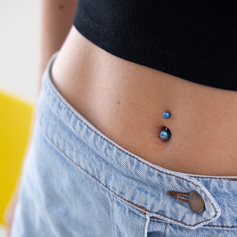 Ti presentiamo qui una barra per ombelico dallo stile semplice, ma dotata di grande personalità. Il gioiello è costituito da un'asta che termina con due accattivanti sfere realizzate in acciaio chirurgico e rivestite poi da uno strato metallico che dona loro un incredibile gioco di colori.