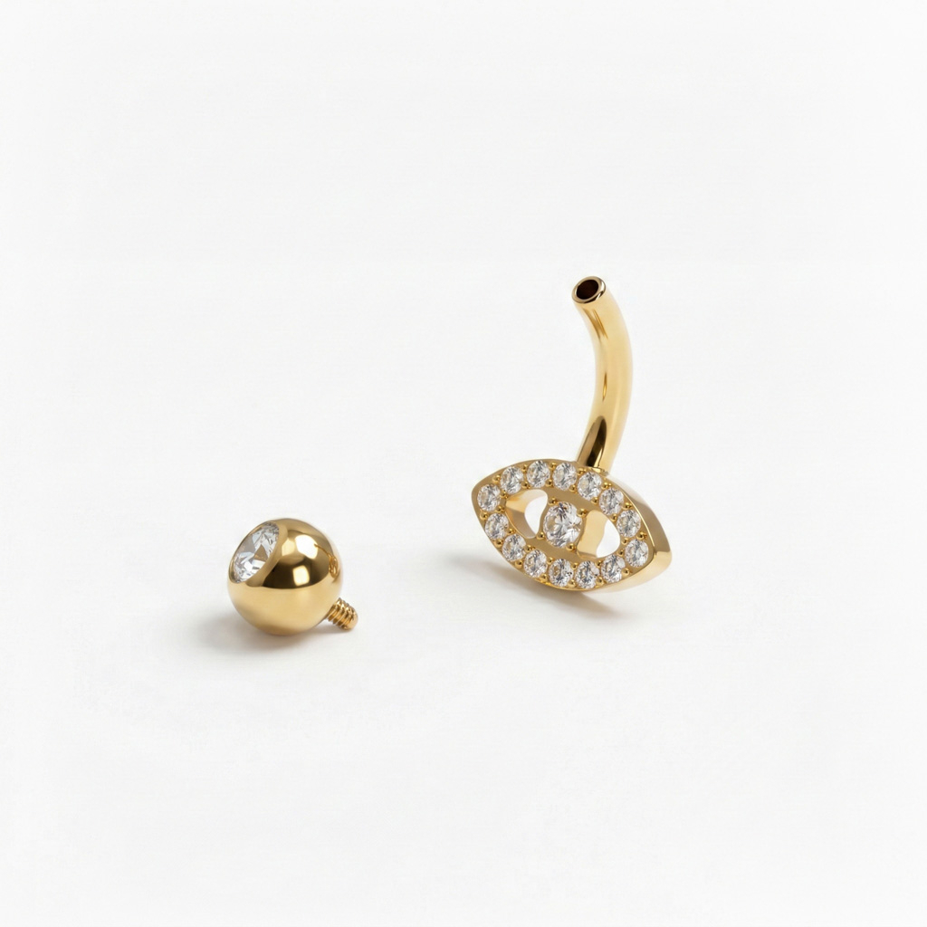 Questa barra per ombelico in titanio con occhio portafortuna dà un tocco simbolico al tuo look. Il motivo dell'occhio, posizionato al centro, è rifinito con piccole pietre che ne delineano i contorni. È espressivo senza esagerare, comodo da indossare e si adatta perfettamente alle giornate più casual che a quelle più sofisticate. Disponibile nei colori oro e grigio argento.