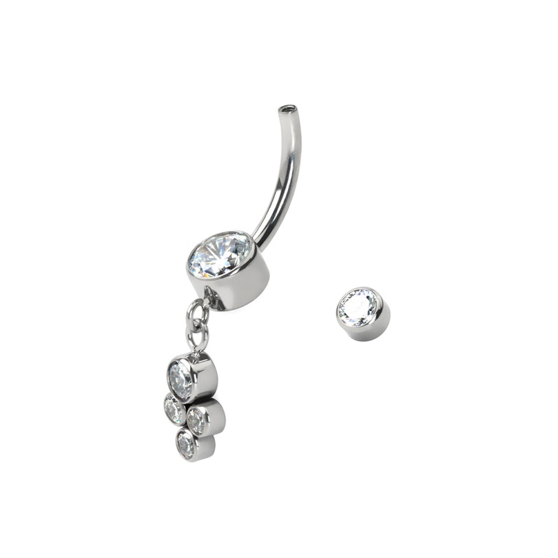 Questa barra per ombelico vanta un tocco di stravaganza con il suo grappolo di 4 pietre che pende da una pietra brillante più grande, e un'ulteriore pietra nel top filettato internamente.