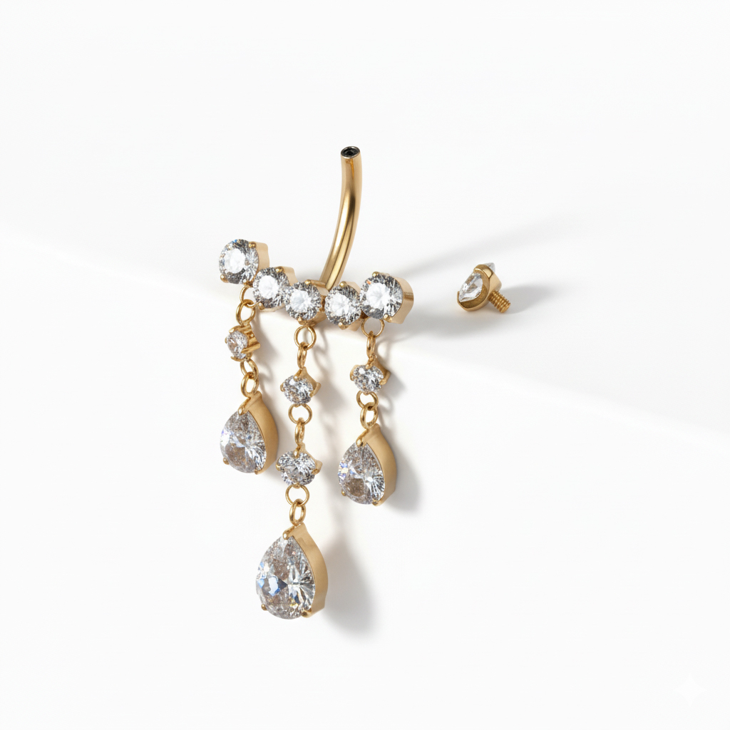La barra per ombelico in titanio con pietre pendenti è fatta per farsi notare. Diverse pietre pendono a goccia, seguendo i tuoi movimenti e regalando al gioiello una presenza unica. È un gioiello ricco di dettagli senza risultare sovraccarico e deciso senza perdere equilibrio. Disponibile nei colori oro e grigio argento, è perfetto se vuoi un look più raffinato.