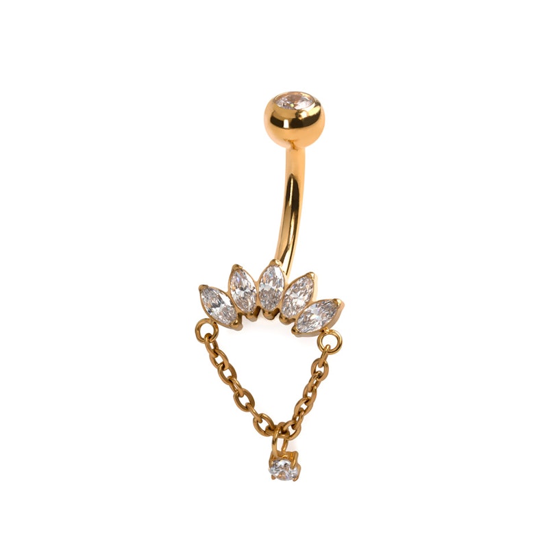 Questa barra per ombelico in titanio con pietre taglio marquise e ciondolo non è un semplice barbell in titanio: è un gioiello con personalità. Le pietre taglio marquise è come formassero una corona, mentre il ciondolo aggiunge il giusto effetto scenico (perché il tuo piercing merita i riflettori).