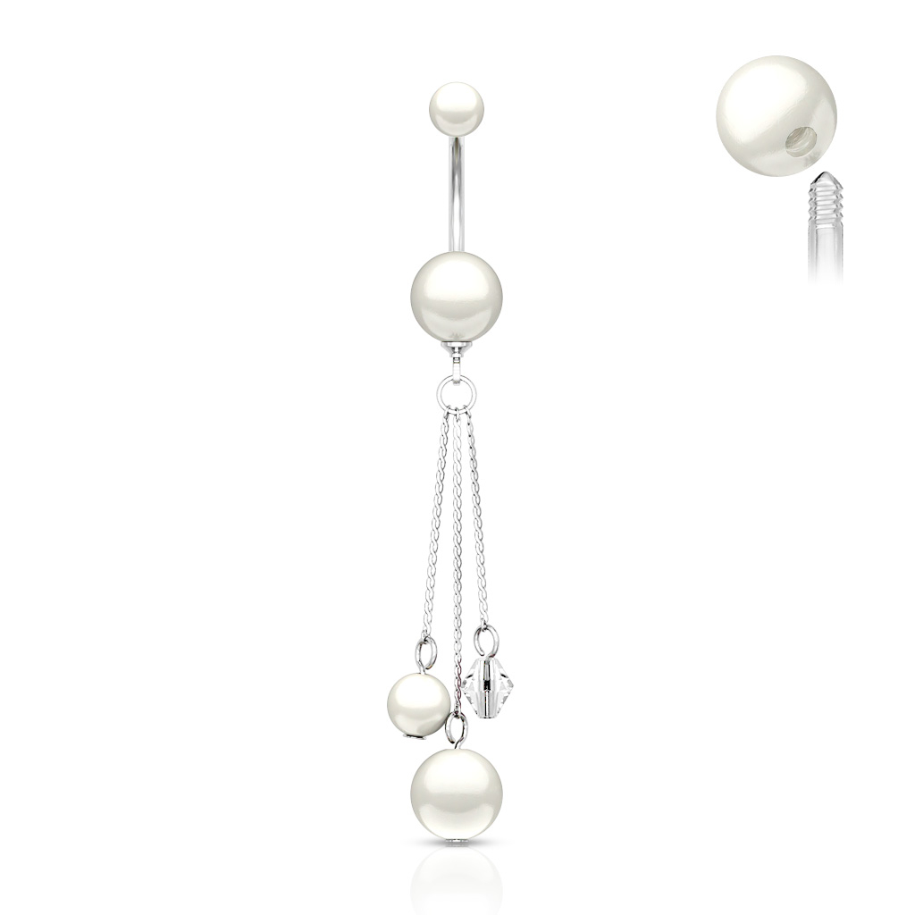 Elegante piercing per ombelico in acciaio chirurgico con un pendente in perle di madreperla. È un piercing classico con diverse catenine pendenti decorate con le perle di madreperla che si trovano anche sulla sfera superiore e quella inferiore.