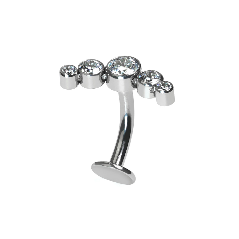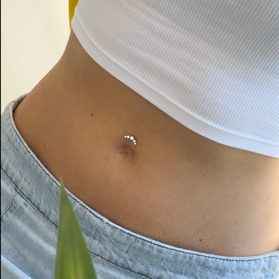 Questa barra per ombelico reverse presenta cinque bellissimi cristalli incastonati. Realizzata in titanio, è ipoallergenica e waterproof. Il gioiello è dotato di un meccanismo di chiusura push-in, il che significa che per fissarlo al piercing è sufficiente piegare lievemente il pin e inserilo nell'asta.
