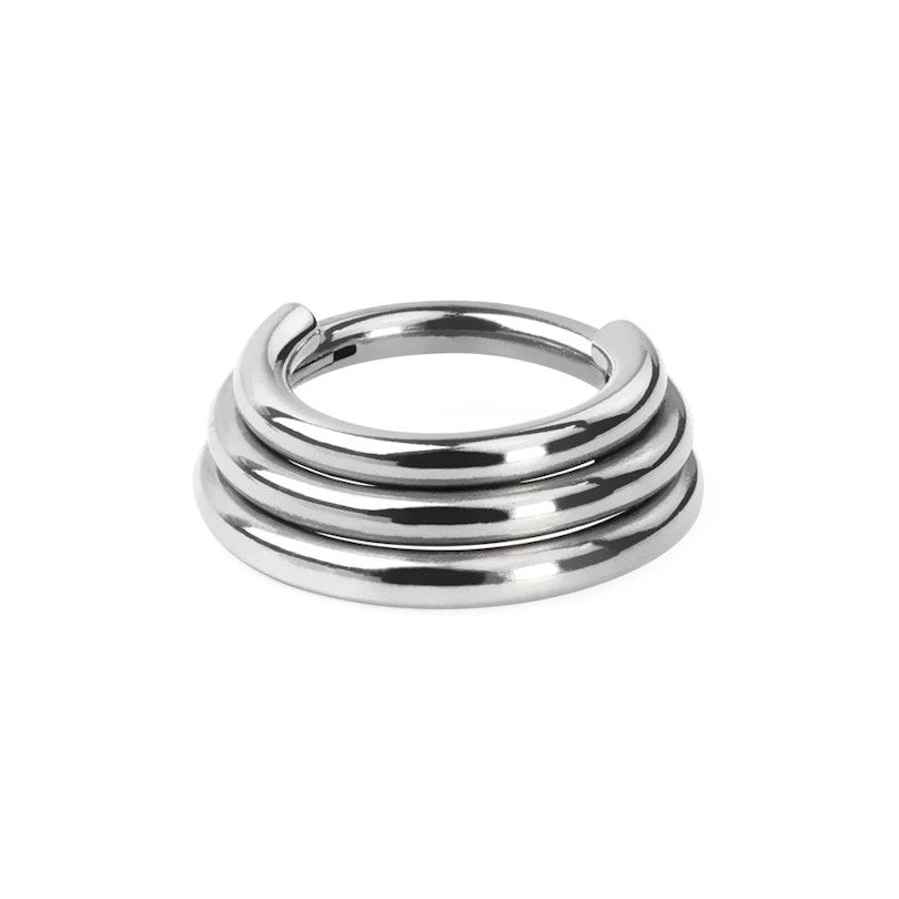 Questa semplice ma efficace trio mi ha conquistato. Sembra davvero tre anelli separati, e questo con solo un foro nell'orecchio! Combinabile con qualsiasi altro gioiello. Grazie alla forma particolare, gli anelli si adagiano bene sul lobo dell'orecchio. Caro team di Bodymod, per favore anche in titanio!0