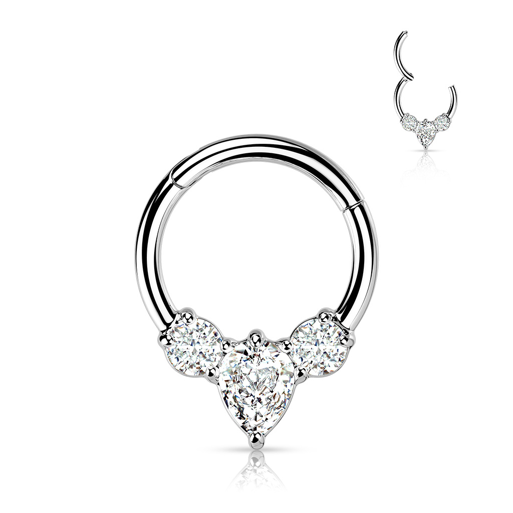Il cerchio presenta un design accattivante con una brillante pietra centrale a forma di pera tra due pietre rotonde un po' più piccole. Le pietre danno sul davanti, rendendo il gioiello perfetto per un piercing al septum o per alcuni piercing all'orecchio, come daith e tragus.