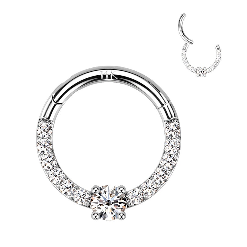 Ci sono un sacco di scintille in questo elegante cerchio di oro 14K che presenta una gemma centrale con lati tempestati di pietre. La parte frontale del cerchio è infatti ricoperta di bellissime pietre che lo rendono un gioiello cattura sguardi soprattutto se indossato al tuo septum o piercing all'orecchio, come helix o daith. Il cerchio è disponibile nel classico oro giallo oppure sofisticato oro bianco, e puoi scegliere il diametro tra 8 mm e 10 mm.
