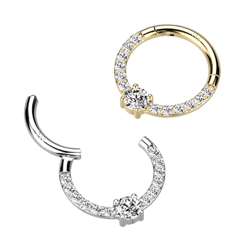 Ci sono un sacco di scintille in questo elegante cerchio di oro 14K che presenta una gemma centrale con lati tempestati di pietre. La parte frontale del cerchio è infatti ricoperta di bellissime pietre che lo rendono un gioiello cattura sguardi soprattutto se indossato al tuo septum o piercing all'orecchio, come helix o daith. Il cerchio è disponibile nel classico oro giallo oppure sofisticato oro bianco, e puoi scegliere il diametro tra 8 mm e 10 mm.