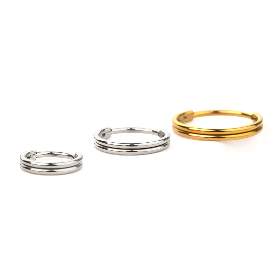 Questo cerchio segment con cerniera ha un look a doppio anello, ma sarà solo uno il cerchio che attraverserà il tuo piercing.