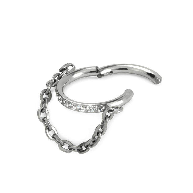 Cerchio in titanio con cerniera decorato con fila di delicate pietre e catena pendente. La catena è attaccata su entrambi i lati, circa a metà per pendere appena sotto la parte inferiore del gioiello.