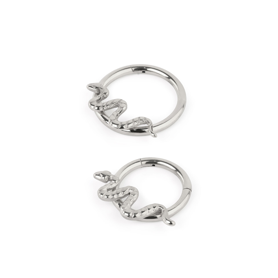 A decorare la parte anteriore del cerchio c'è uno stupendo design a serpente. Tieni in considerazione la posizione del serpente quando pensi in che piercing indossarlo.