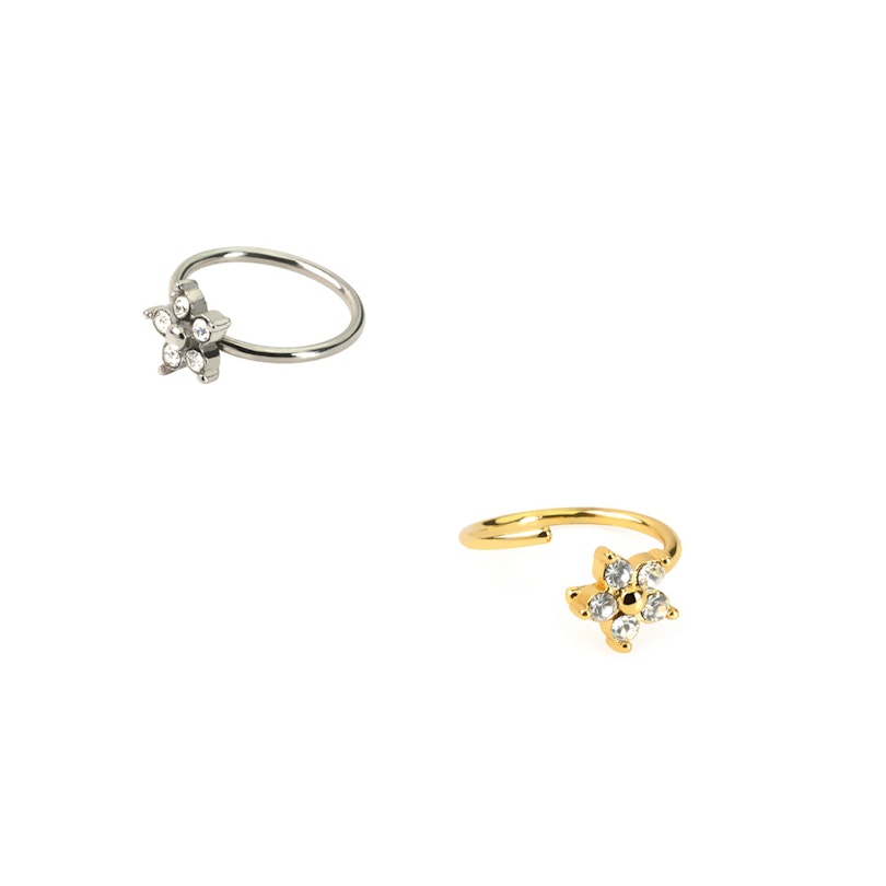 Questo cerchio in acciaio chirurgico presenta un delicatissimo fiore con cinque petali formati da pietre attorno a una pietra centrale. Disponibile nelle finiture color oro giallo e grigio brillante, questo gioiello è in acciaio chirurgico quindi è forte, duraturo e non si ossiderà. Con il suo sottile diametro del filo di 0,8 mm è ideale per i piercing al naso ma può essere indossato anche all'helix o altri piercing all'orecchio. Indossarlo è facilissimo: torcilo per aprilo, quindi inseriscilo nel tuo piercing e torcilo di nuovo per fissarlo.