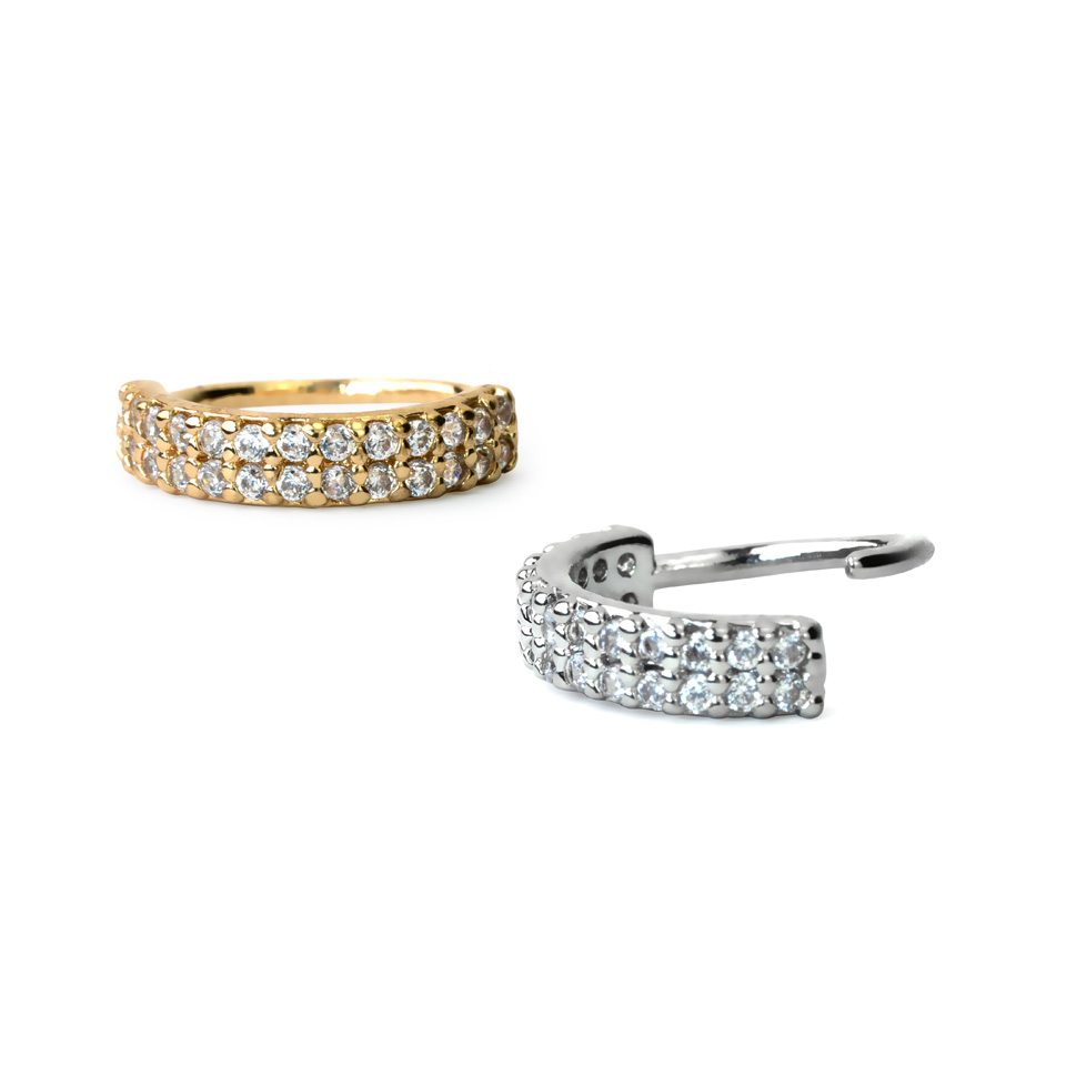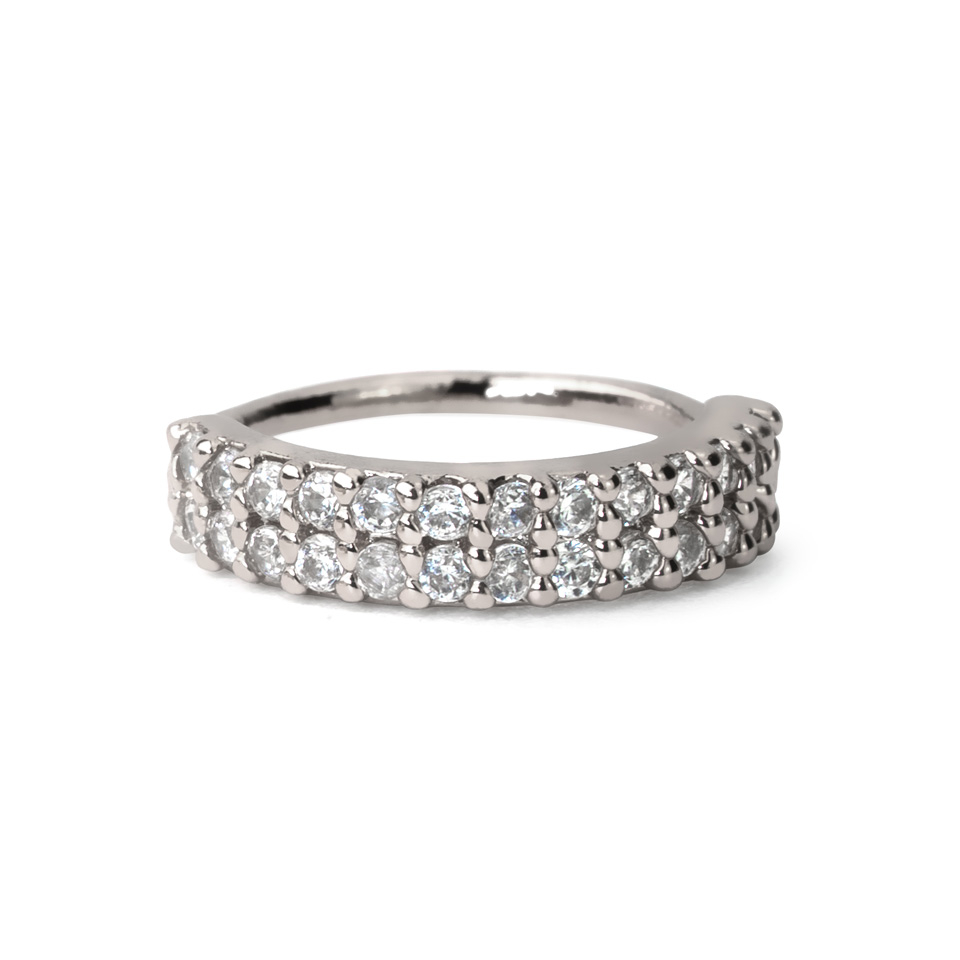 In ogni cerchio sono presenti due file di pietre, che ne coprono quasi la metà. In totale vi sono 26 piccole pietre chiare scintillanti. L'altra metà del cerchio invece sarà nascosta nel tuo piercing.