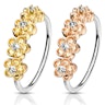 Il gioiello è realizzato in acciaio chirurgico, mentre gli elementi decorativi sono di ottone poi rivestiti in oro 14 carati. Gli eleganti fiori che rendono speciale questo cerchio possono essere scelti tra due colori, e ogni fiore ha una pietra trasparente al suo centro.