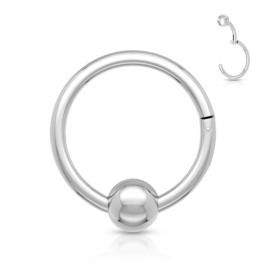 Di solito quando si parla di cerchi con sfera, quest'ultima è usata come sistema di bloccaggio e può essere quindi rimossa e reinserita. Tuttavia, non è il caso di questo gioiello. Qui, la sfera fa parte dell'anello stesso: è collegata ad una piccola barra, che viene fissata al resto del gioiello grazie a un cardine. Ciò ti consente di aprire facilmente il gioiello con un semplice click. E quando vuoi chiuderlo, fai la stessa cosa ma esattamente al contrario - la fine del cerchio si inserirà in una piccola rientranza che ha la sfera.