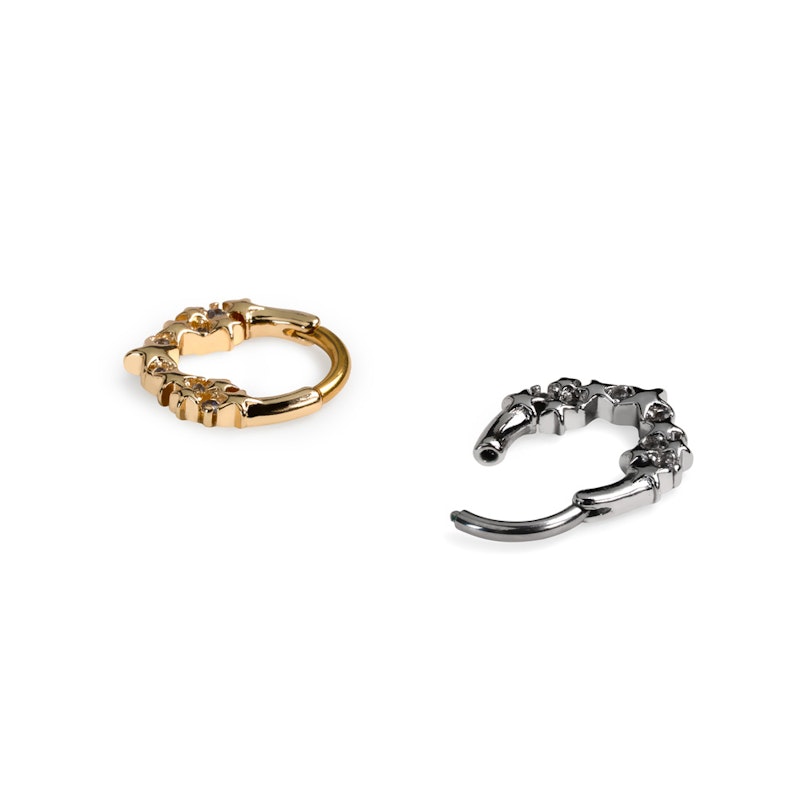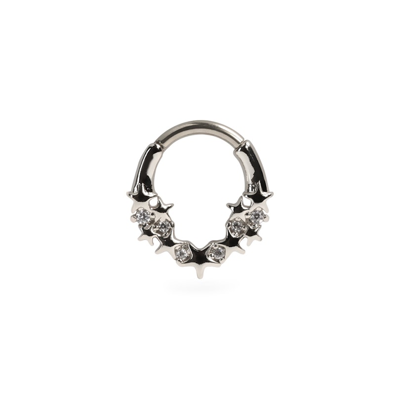 Questo cerchio con stelle e pietre frontali sarà un'ottima aggiunta alla tua collezione. È dotato di cerniera, quindi sarà facilissimo inserirlo e fissarlo al tuo piercing.