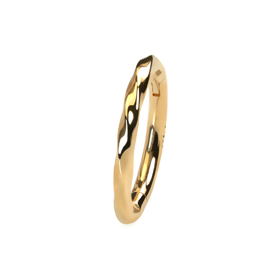 Questo bellissimo cerchio con cerniera è realizzato in oro 14K e presenta un interessante design lievemente intrecciato che dà al gioiello un tocco elegante e senza tempo. È perfetto per una varietà di piercing all'orecchio come lobo, helix, tragus, daith e rook. La chiusura a cerniera ne garantisce l'inserimento semplice e la comodità totale.