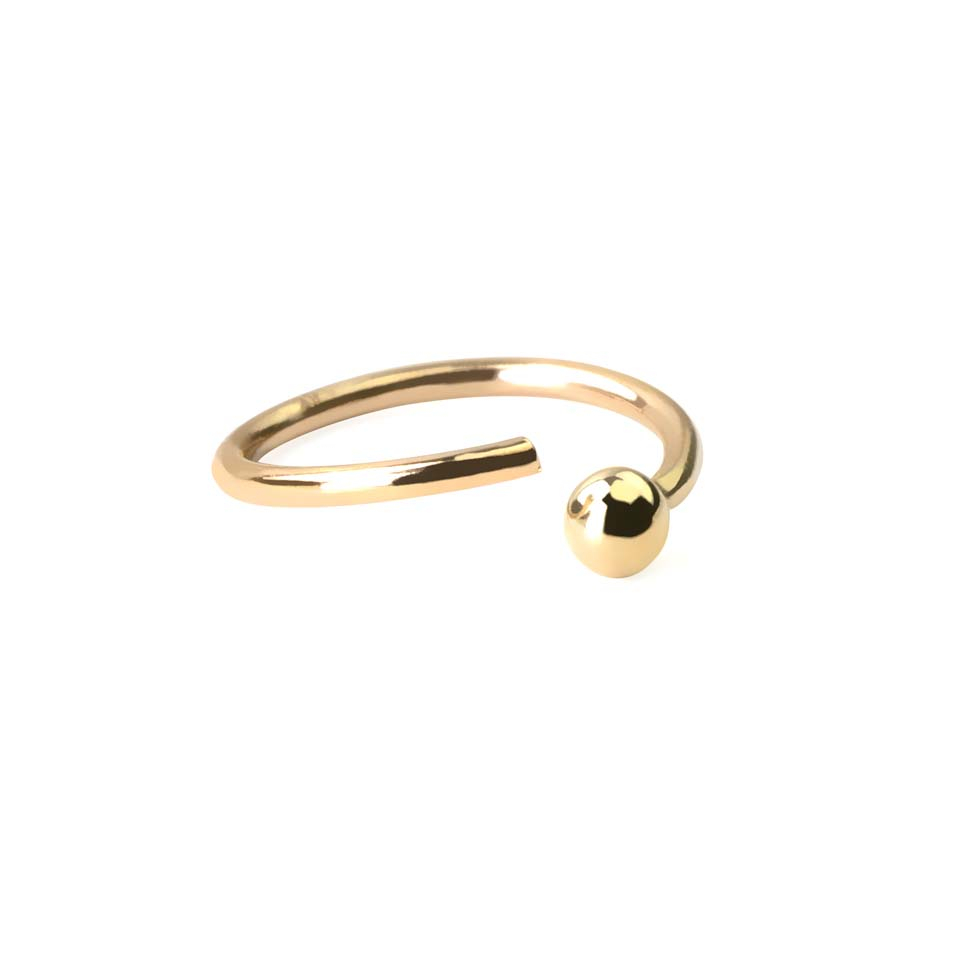 Eccoti qui un fantastico cerchio in oro 14k dotato di stile e praticità. Questo gioiello dal design semplice presenta un cerchio e una sfera, con un meccanismo di chiusura incredibilmente efficace. La sfera è saldata su una delle due estremità del cerchio, diventando parte integrante di esso. In poche parole: è un pezzo unico senza parti che potrebbero staccarsi.