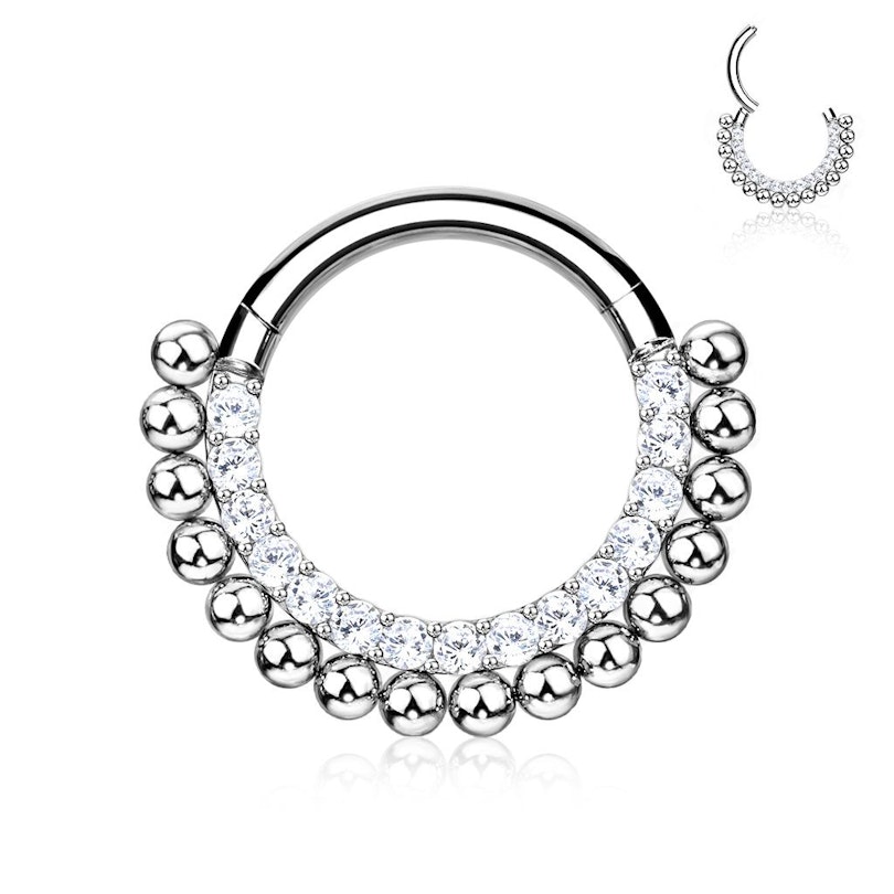 Il titanio è uno dei materiali migliori che puoi avere per il tuo piercing. Per questo motivo, normalmente è anche il materiale che si usa per piercing appena fatti. Di solito però i gioielli in titanio sono noiosi, senza pietre o ornamenti. Tutto cambia con questo gioiello e le sue tante pietre preziose e piccole borchie rotonde all'estremità. Il cerchio è dotato di una chiusura a cerniera, il che significa che il meccanismo di chiusura è semplicissimo: basta inclinare le estremità nelle direzioni opposte per aprirlo o chiuderlo.