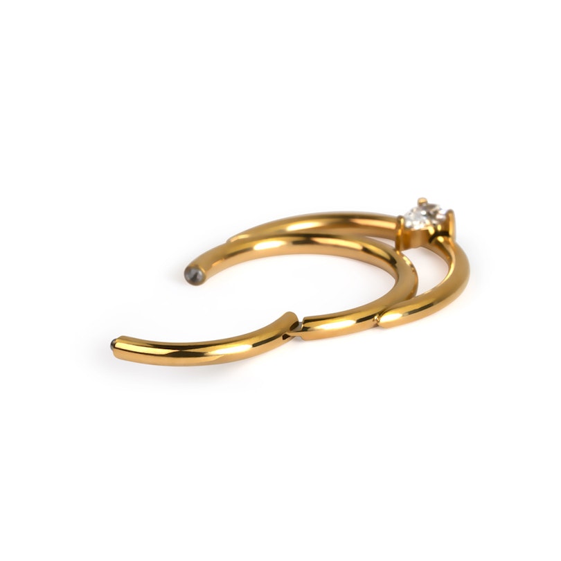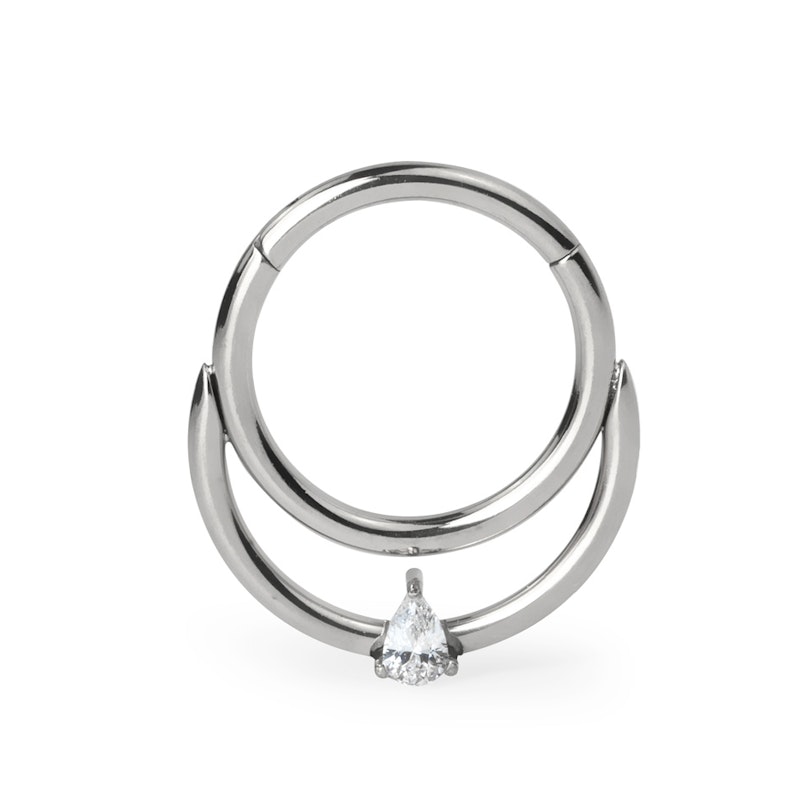 Cerchio segment in titanio con cerniera e pietra a goccia accompagnata da doppio anello. Questo stupendo gioiello trascende eleganza con la sua intramontabile pietra a goccia che interconnette i due anelli per un look da sogno. É disponibile nei colori oro giallo e grigio brillante. Ha un diametro del filo di 1,2 mm e un diametro totale di 8 mm o 10 mm, è perfetto quindi, tra gli altri, per i piercing helix, daith e septum.