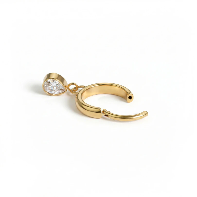 Presenta uno stupendo pendente a forma di goccia con pietra di zirconia cubica incastonata, attaccato al cerchio da due delicati anelli. La goccia misura 4,5 mm.