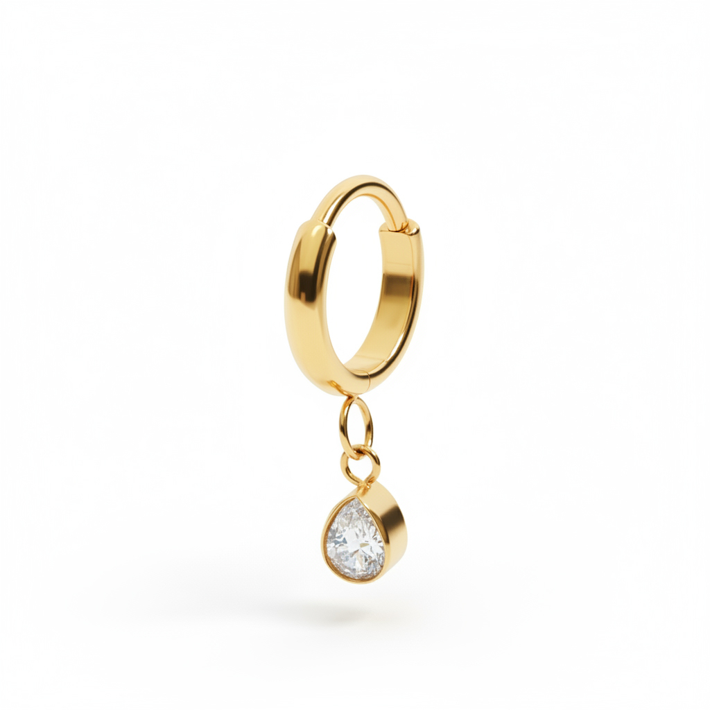 Presenta uno stupendo pendente a forma di goccia con pietra di zirconia cubica incastonata, attaccato al cerchio da due delicati anelli. La goccia misura 4,5 mm.