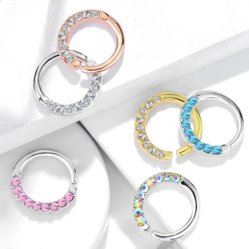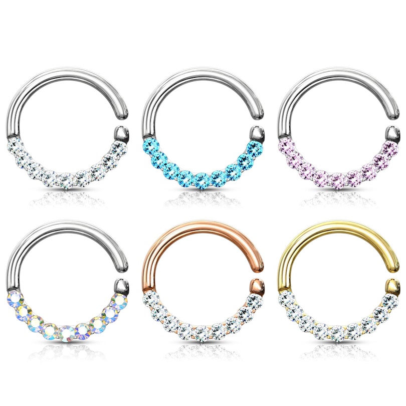 Hai sicuramente anche notato la brillante fila di pietre nella parte visibile del cerchio, che copre l'intero semicerchio inferiore, ovvero la parte che sarà visibile quando indossi il gioiello nel tuo piercing. Puoi scegliere anche il colore delle pietre di zirconia tra varie opzioni. Nota che però i modelli oro giallo e oro rosa avranno sempre le pietre trasparenti, per un look favoloso.