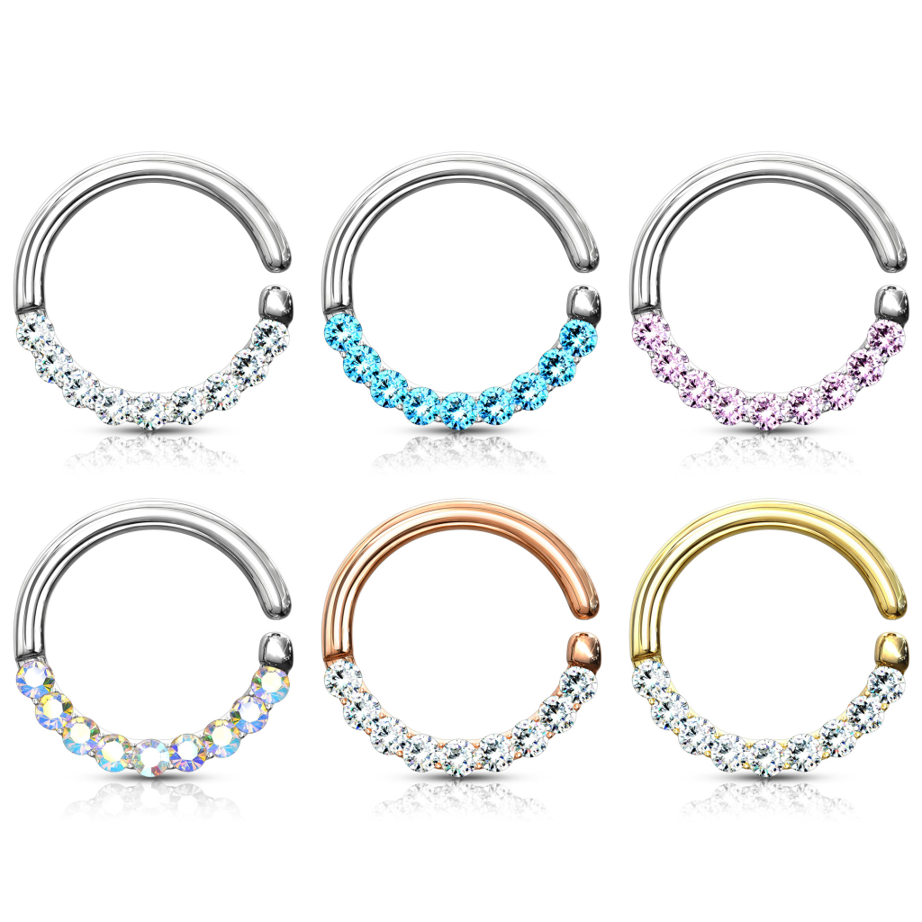 Hai sicuramente anche notato la brillante fila di pietre nella parte visibile del cerchio, che copre l'intero semicerchio inferiore, ovvero la parte che sarà visibile quando indossi il gioiello nel tuo piercing. Puoi scegliere anche il colore delle pietre di zirconia tra varie opzioni. Nota che però i modelli oro giallo e oro rosa avranno sempre le pietre trasparenti, per un look favoloso.