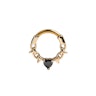 Questo cerchio rivolto in avanti presenta un design a filo spinato e una pietra centrale nera a cuore. Dotato di cerniera, è facile da inserire e fissare nel tuo piercing.
