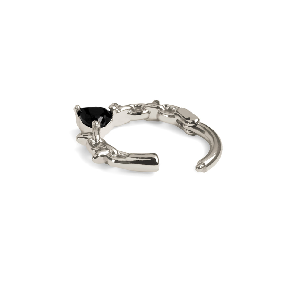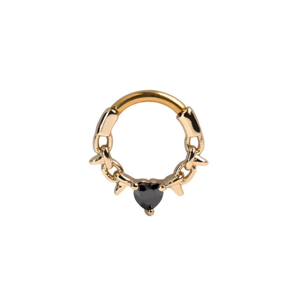Questo cerchio rivolto in avanti presenta un design a filo spinato e una pietra centrale nera a cuore. Dotato di cerniera, è facile da inserire e fissare nel tuo piercing.